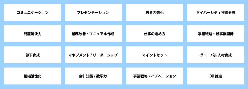 役員研修、経営幹部研修、リーダー研修、新入社員研修からマーケティング、コンプライアンス、リーダーシップ、イノベーション、DXなどのテーマ別研修まで、「組織・階層・部門別」「経営課題・ビジネススキル別」にさまざまな研修プログラムやセミナー、ワークショップなどを実施することができます。